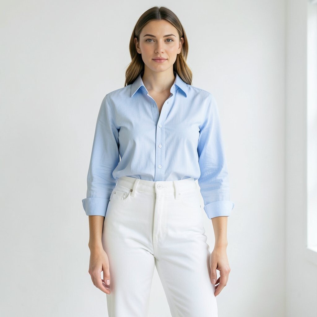 Clean white jeans and a light blue button-up create a neat look that feels easy and bright. The outfit has a soft, airy feel that works well for lunch dates, office days, or casual meetings.