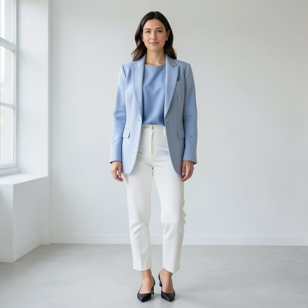 White ankle pants and a powder blue blazer create a fresh suit-like look that feels smart and stylish. The soft blue shade keeps the outfit from feeling too stiff, while the white pants brighten everything up.