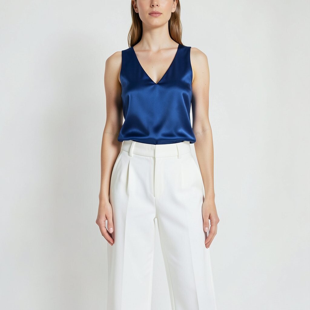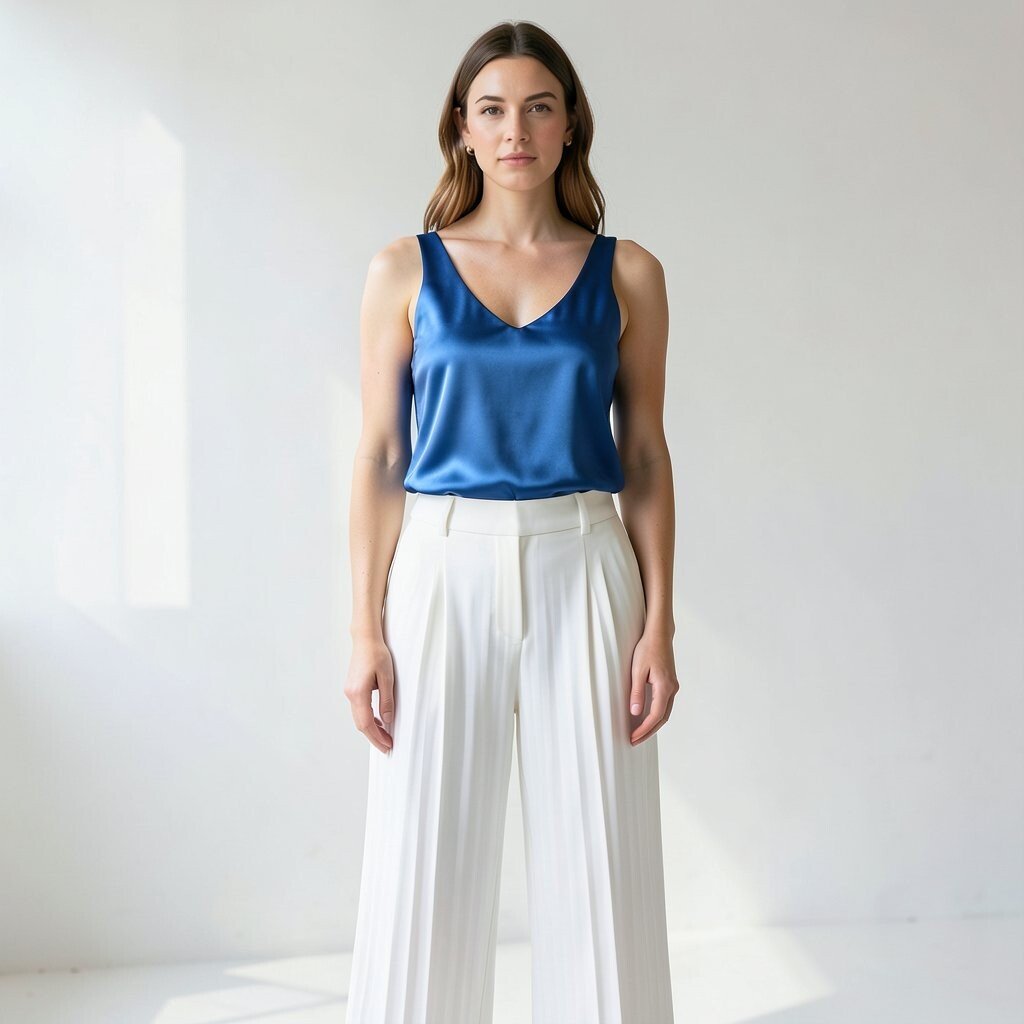 White pleated pants feel crisp and elegant, and a blue satin camisole adds a smooth, shiny finish. The look is light but dressy, so it works for events that need a little polish.
