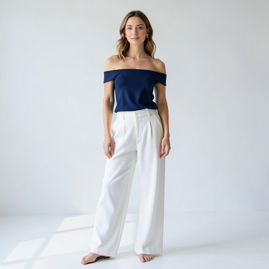 Flowy white pants bring movement and softness, and a navy off-shoulder top adds a pretty, dressy touch. The open neckline draws attention upward and gives the outfit a fun, flirty feel.