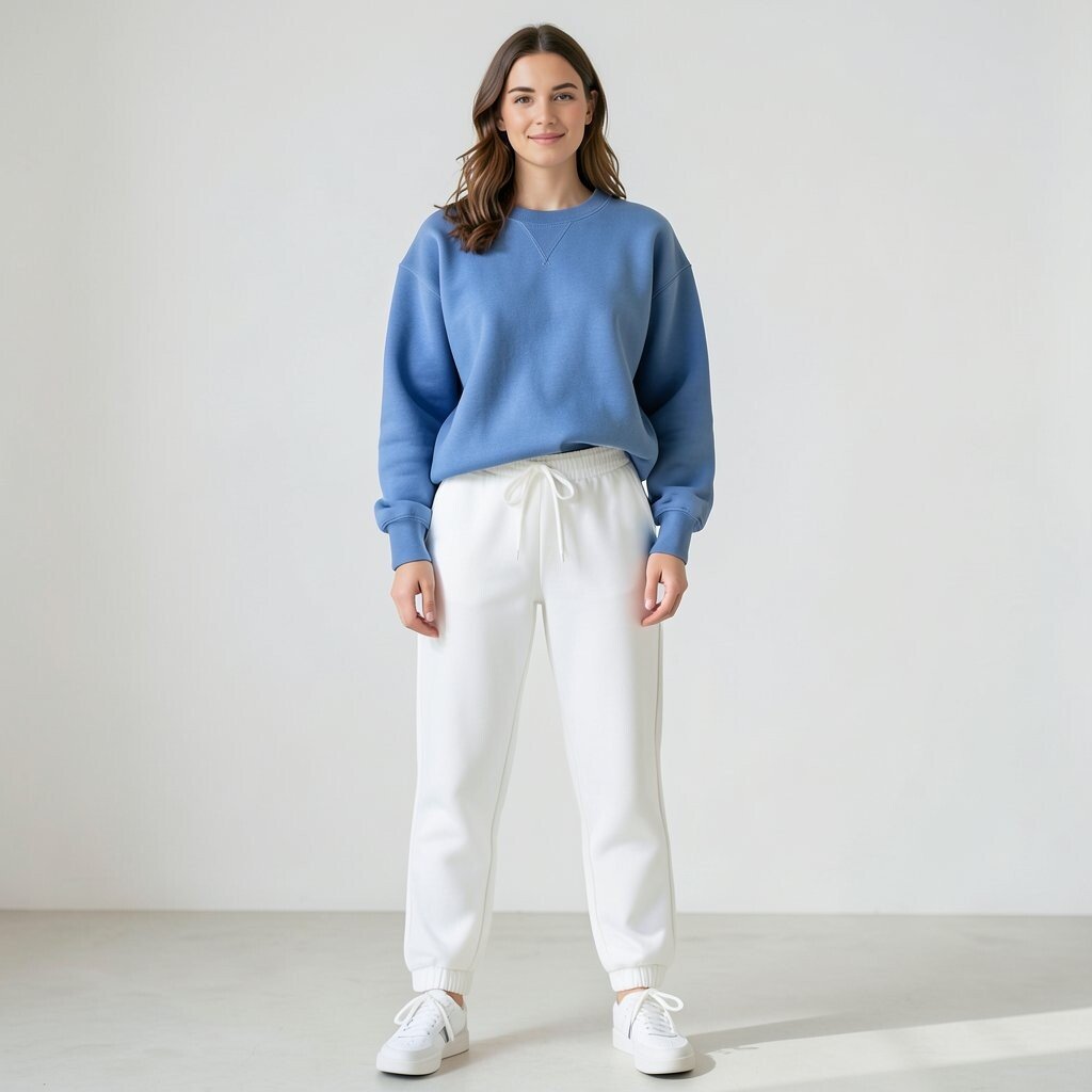 White joggers and a blue sweatshirt make a cozy outfit that still looks fresh and bright. The soft shapes feel easy for travel, errands, or a lazy weekend at home.