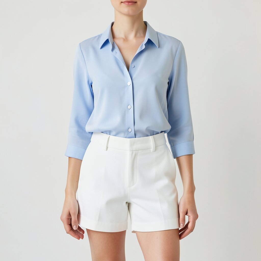 White tailored shorts and a soft blue blouse make a neat warm-weather outfit with a polished feel. The shorts keep it light, while the blouse adds a gentle, pretty touch.