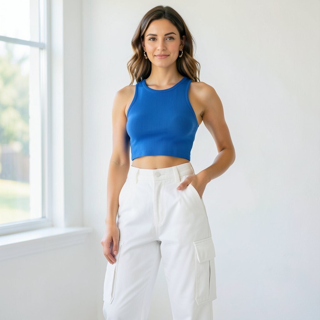 White cargo pants give a cool street-style edge, and a blue ribbed crop top keeps the look fresh and fitted. The mix of loose and snug shapes creates a nice balance that feels modern.