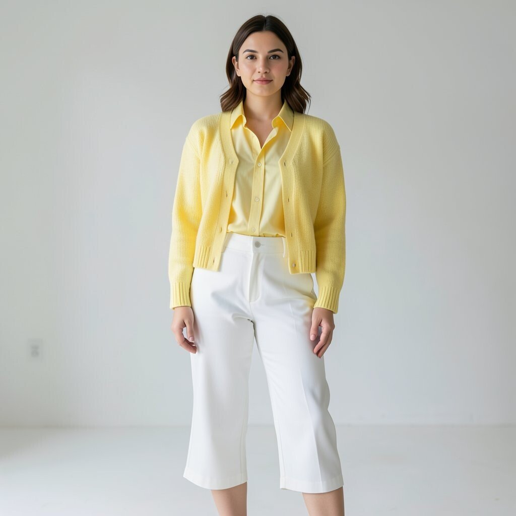 White cropped trousers and a yellow cardigan make a soft outfit with a cozy feel. The cardigan can be worn buttoned, open, or tied, which gives you a lot of styling room.