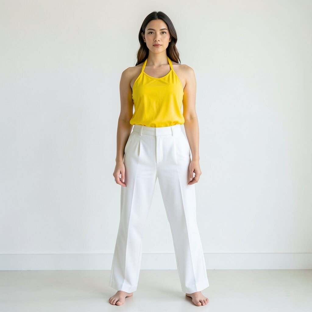 White high-waist pants and a yellow halter top make a sleek and sunny outfit. The open shoulders and high waist create a strong shape that feels confident and clean.