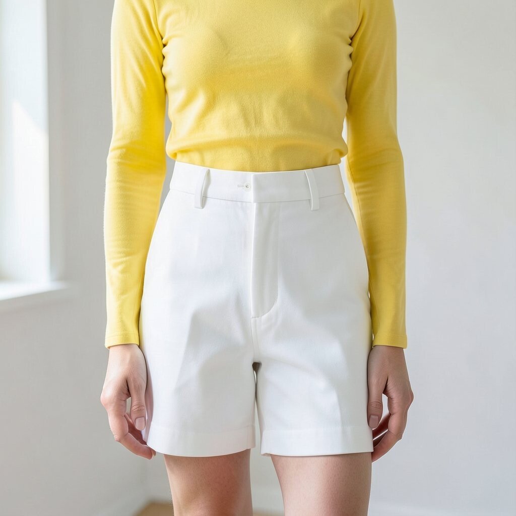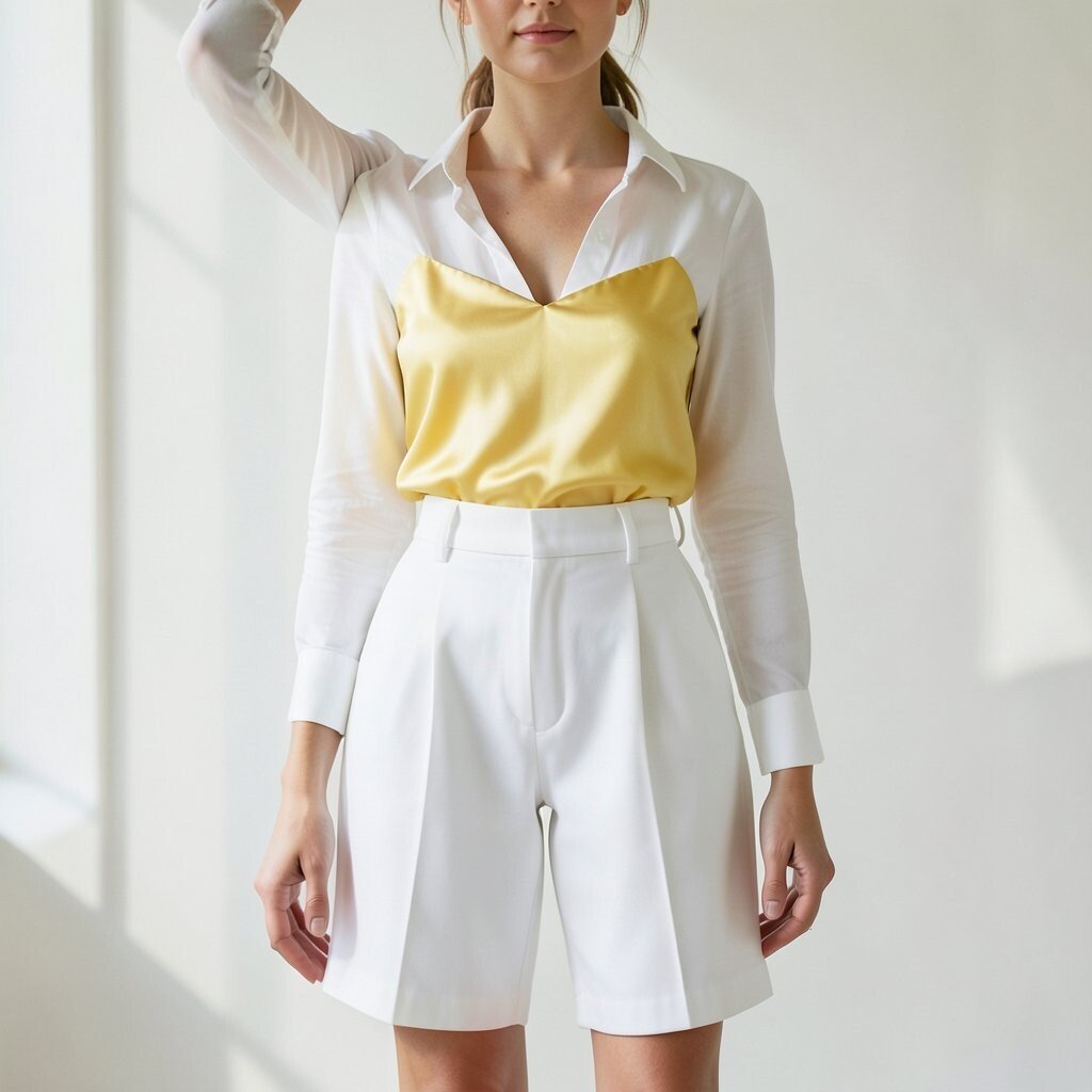White tailored shorts and a yellow long-sleeve top make a smart and playful outfit. The shorts keep things light, while the long sleeves add balance and a little surprise.