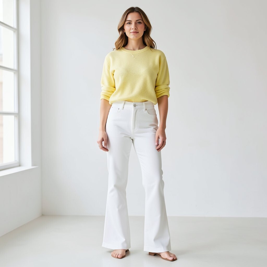 White flare pants and a light yellow knit top create a smooth, retro-inspired look. The flared shape gives a little drama, while the knit keeps the outfit soft and cozy.