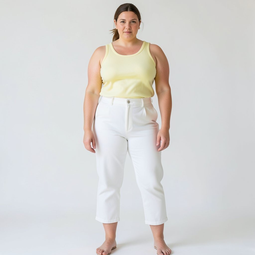 Cropped white pants and a pale yellow tank create a light, airy outfit that feels perfect for warm days. The shorter pant length shows the ankle and keeps the look fresh.