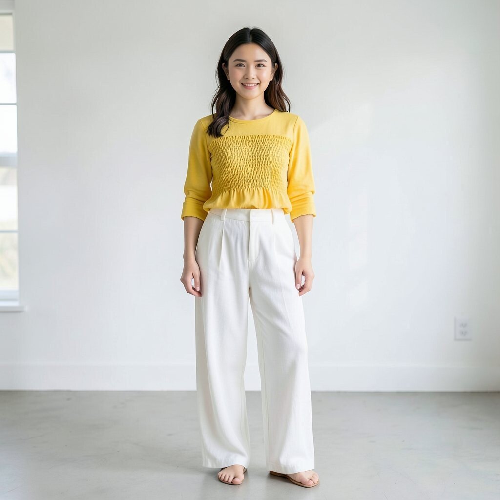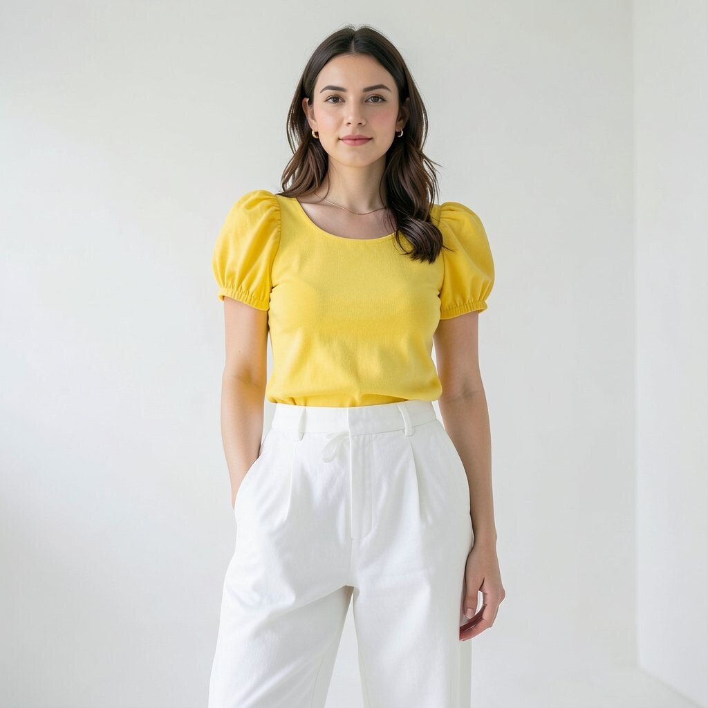 White pants and a yellow shirt make a bright, happy pair. The look can feel fresh, calm, bold, or playful in just a few changes.