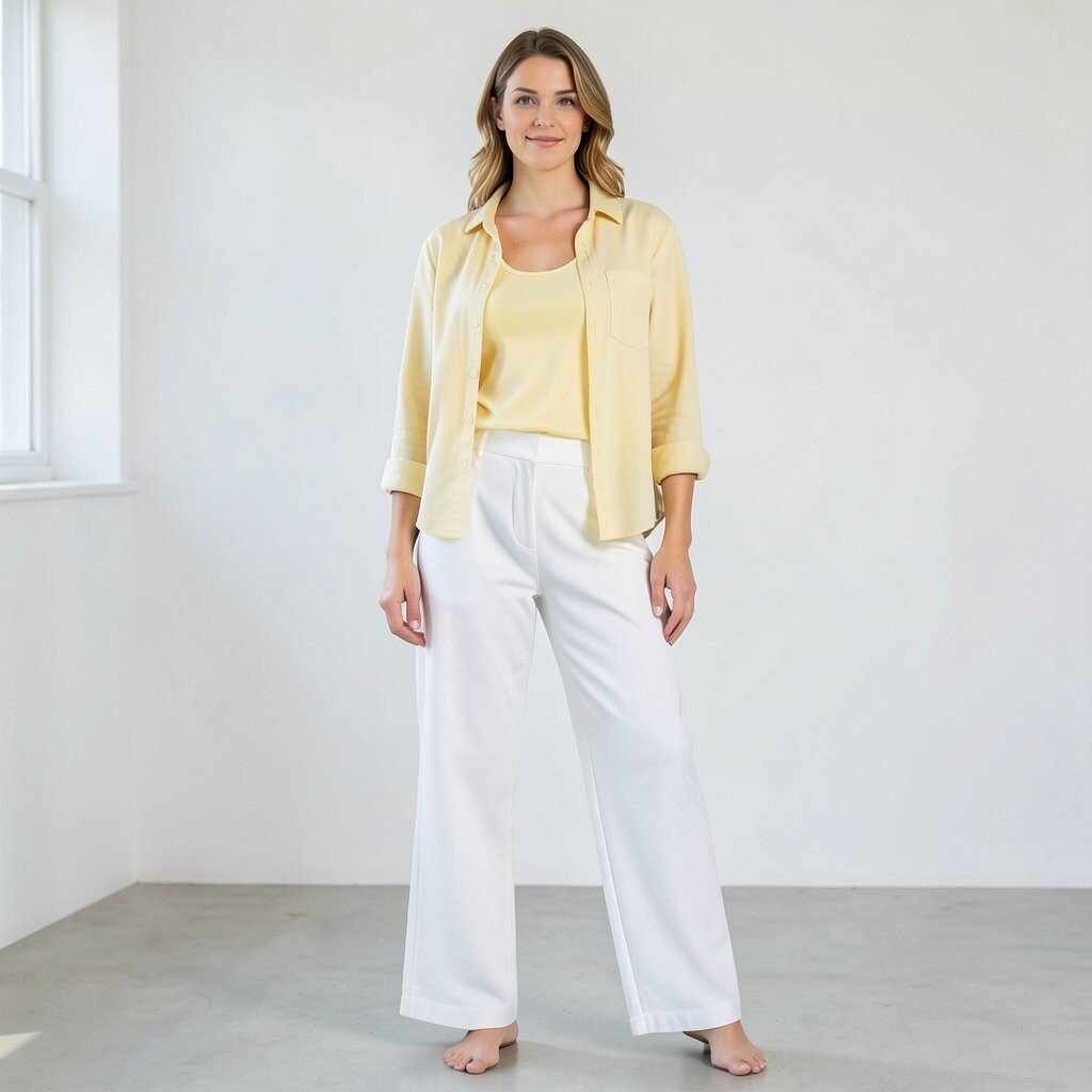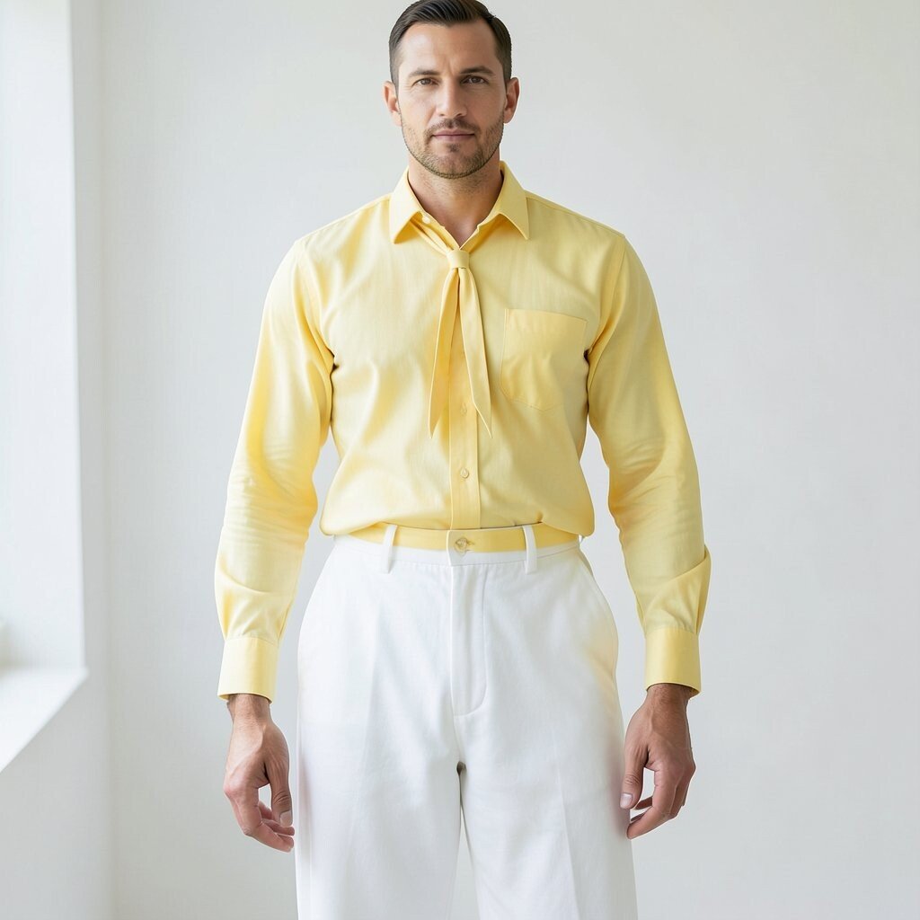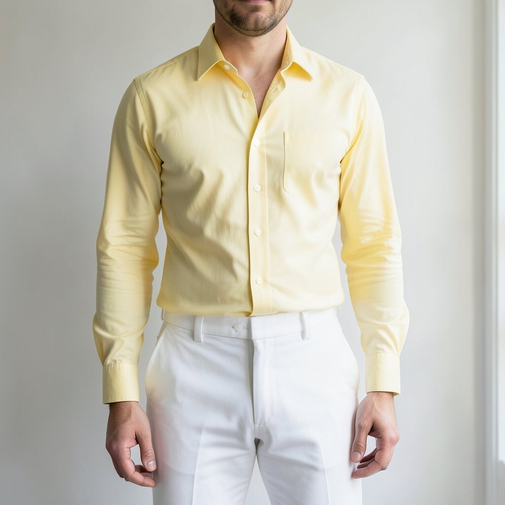 A butter yellow button-up with clean white pants creates a soft and polished look. The pale color mix feels gentle on the eyes and easy to wear.