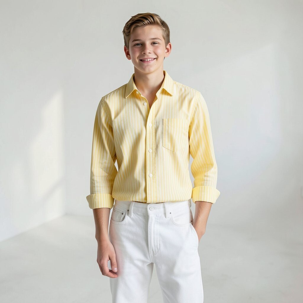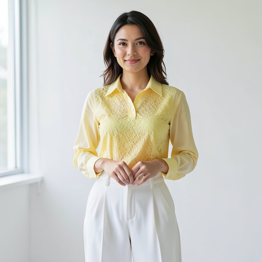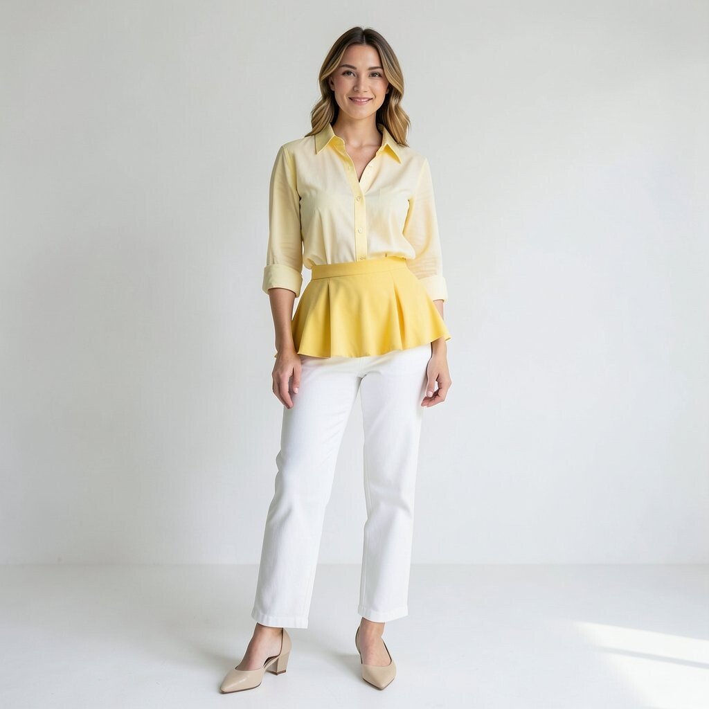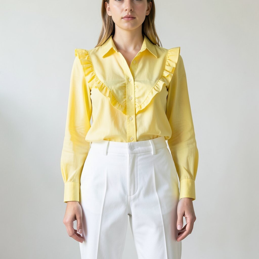 A butter yellow button-up with clean white pants creates a soft and polished look. The pale color mix feels gentle on the eyes and easy to wear.
