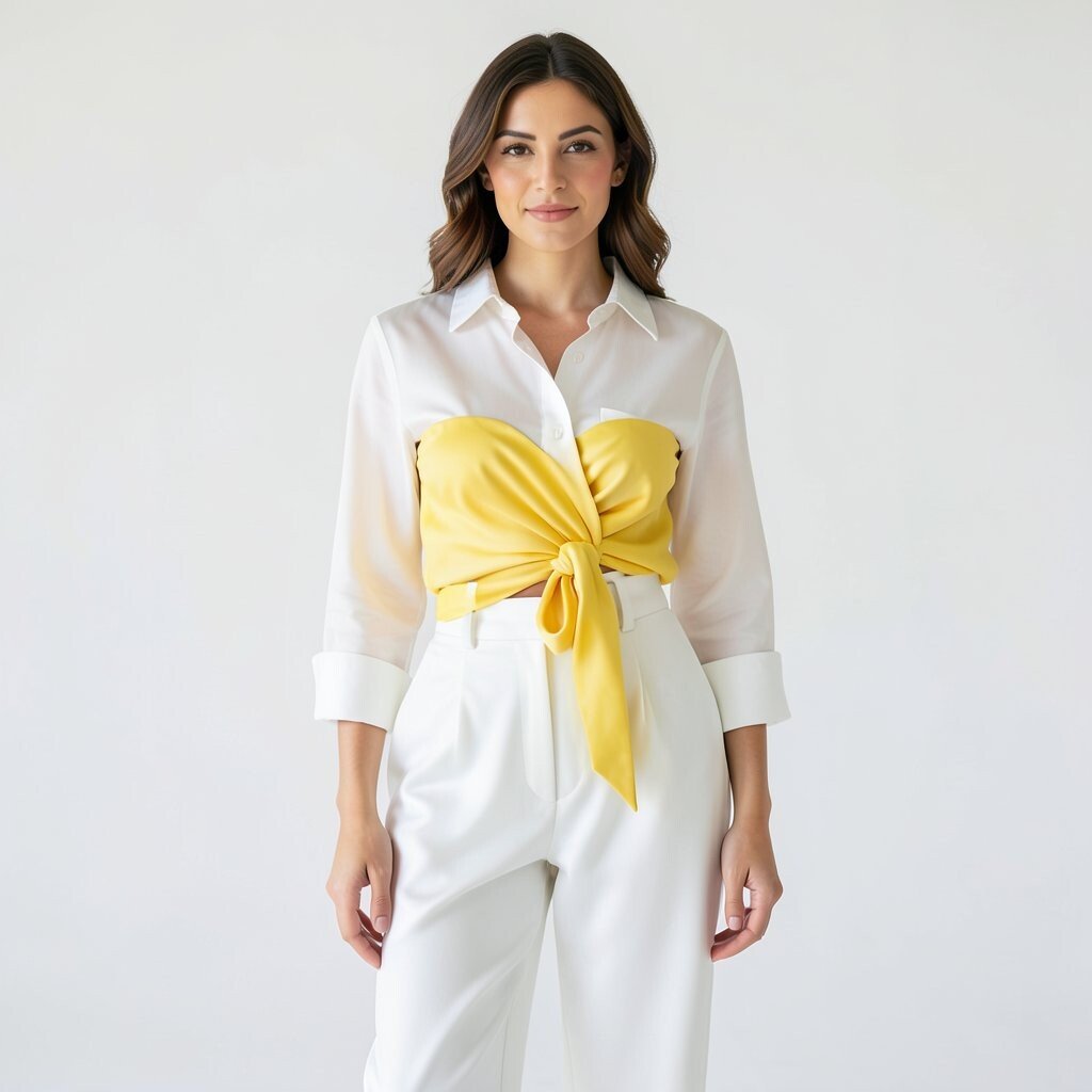 White relaxed pants and a yellow tie-front shirt create a breezy outfit with a playful shape. The tie detail adds interest at the waist, and the loose pants keep the style easy.