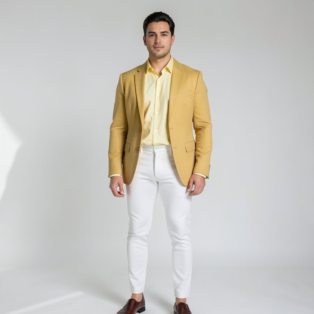 White slim pants and a golden yellow blazer make a sharp outfit with bright energy. The blazer adds structure, while the white pants keep the look clean and open.