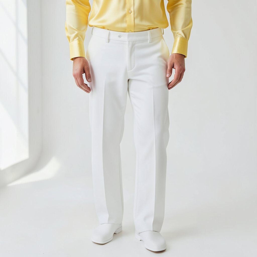 20. White Straight-Leg Pants with a Yellow Satin Button-Down