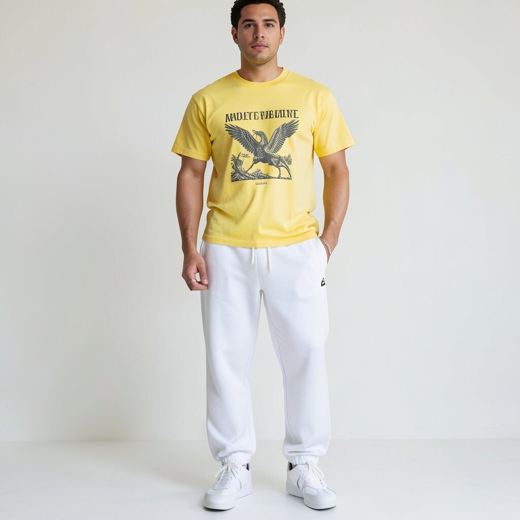 White joggers and a yellow graphic tee create a sporty outfit with a fun, youthful feel. The graphic print adds personality, and the joggers keep things soft and casual.