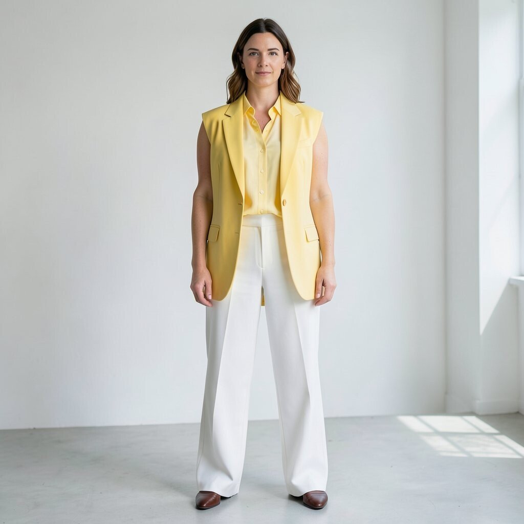 White palazzo pants and a yellow sleeveless blazer create a sharp and fashion-forward outfit. The blazer adds a tailored feel, while the wide pants keep the look flowing and easy.