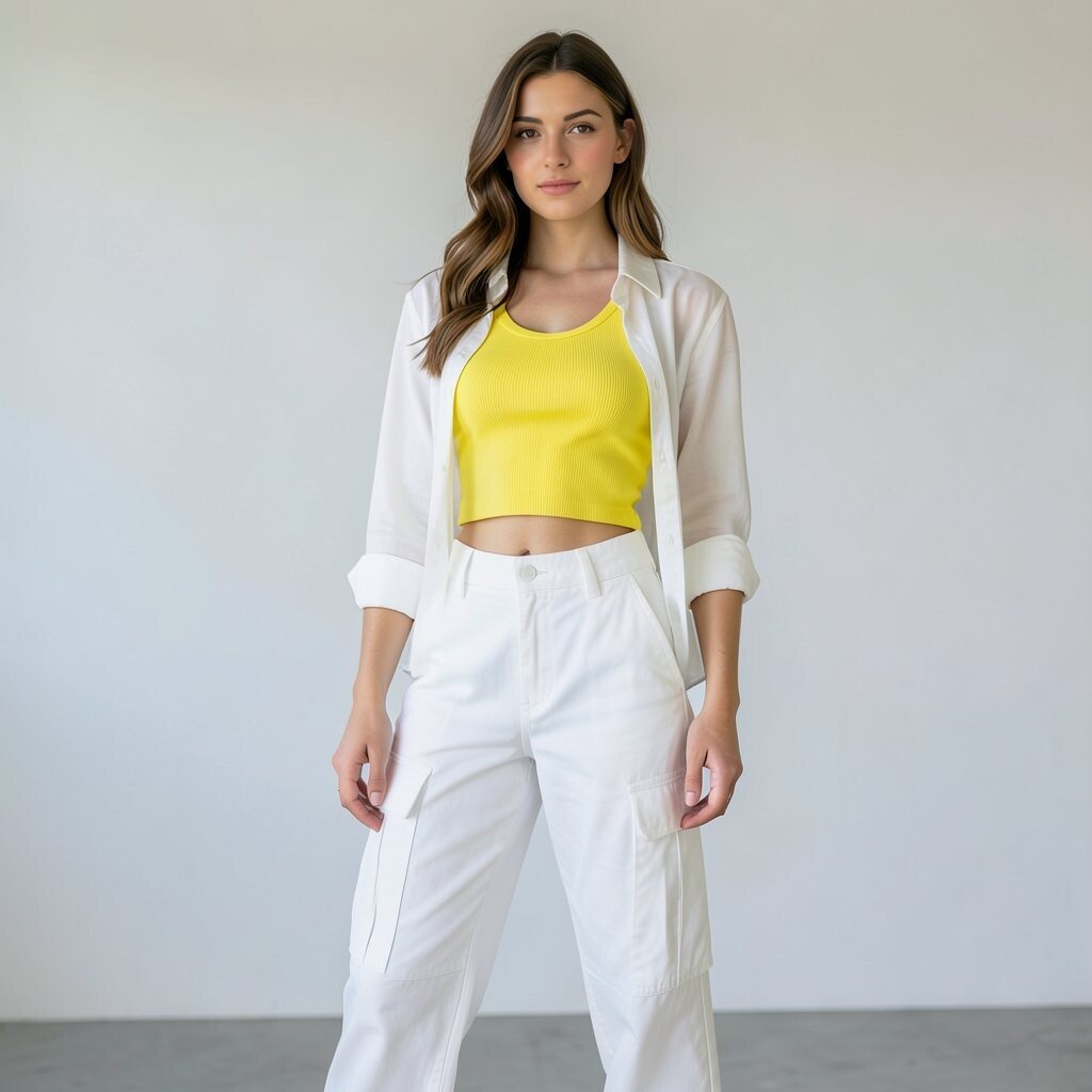 White cargo pants and a bright yellow crop top create a bold, sporty outfit with a cool edge. The pockets and shape of the pants add interest, so the look feels modern right away.