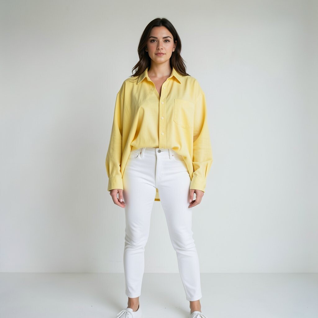 White skinny jeans and a yellow oversized shirt make a simple outfit with a relaxed top and a neat base. The loose shirt gives movement, while the fitted jeans keep the shape from feeling too baggy.
