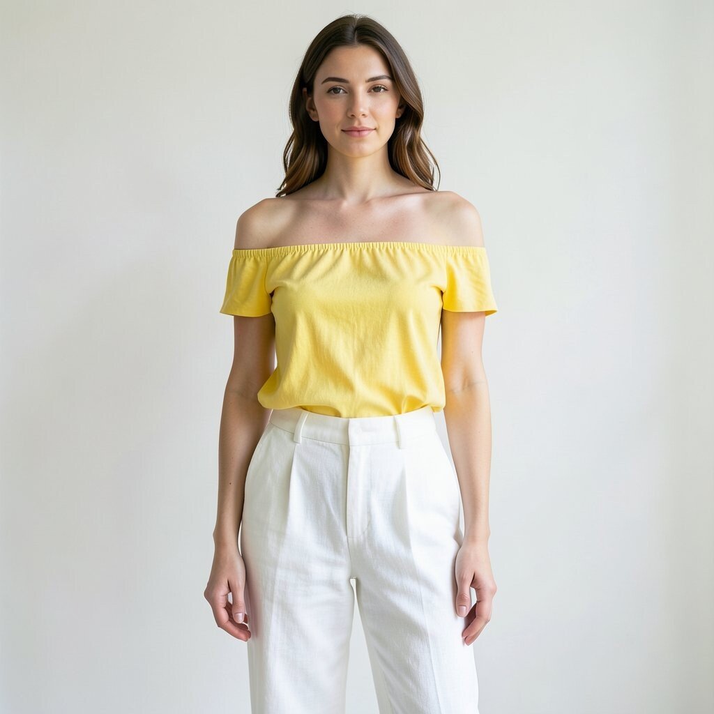 White linen pants and a yellow off-the-shoulder top create a breezy, vacation-ready look. The open neckline feels playful, while the linen keeps the outfit relaxed and cool.