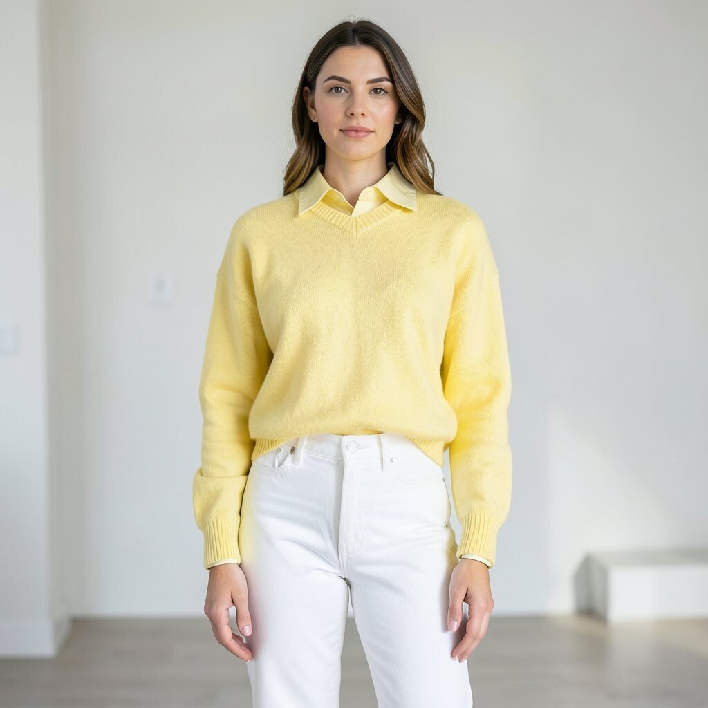 Straight white jeans and a lemon yellow sweater make a cheerful outfit with a cozy feel. The bright knit brings color near the face, which can give the whole look a lively glow.