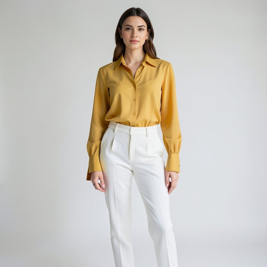 Tailored white trousers paired with a mustard yellow blouse give a rich and smart look. The deeper yellow shade adds warmth and makes the outfit feel a little more grown-up.