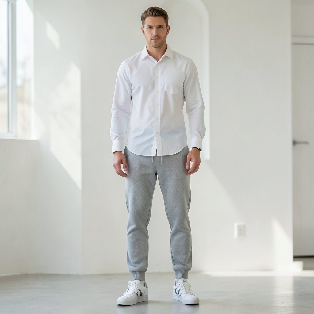 A white shirt with joggers and sneakers makes a sporty outfit that still looks neat. The shirt keeps the look fresh, while the joggers bring comfort and ease.