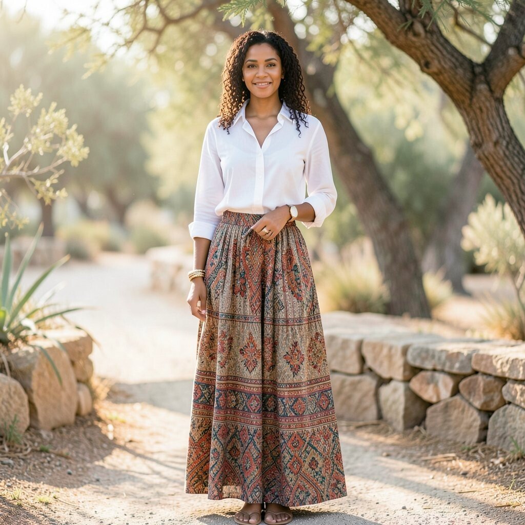 Channel your inner bohemian by pairing your white shirt with a flowy maxi skirt. This combination is perfect for creating a relaxed, yet stylish silhouette. Opt for earthy tones or floral prints to enhance the boho feel.