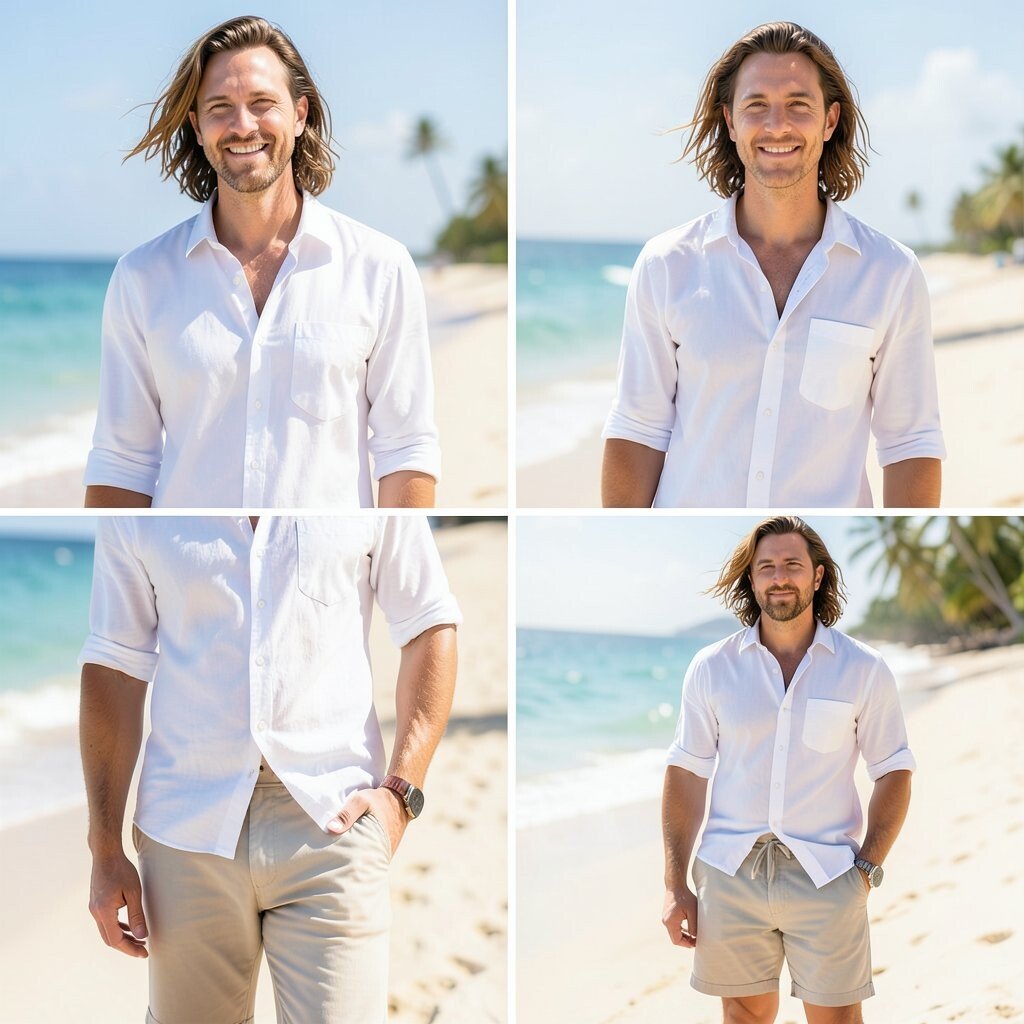 For a beach-ready outfit, pair your white shirt with light linen shorts or a flowy beach skirt. The lightweight fabric is perfect for warm weather and gives off a relaxed, breezy vibe. Add a straw hat and sandals for the ultimate beach look.