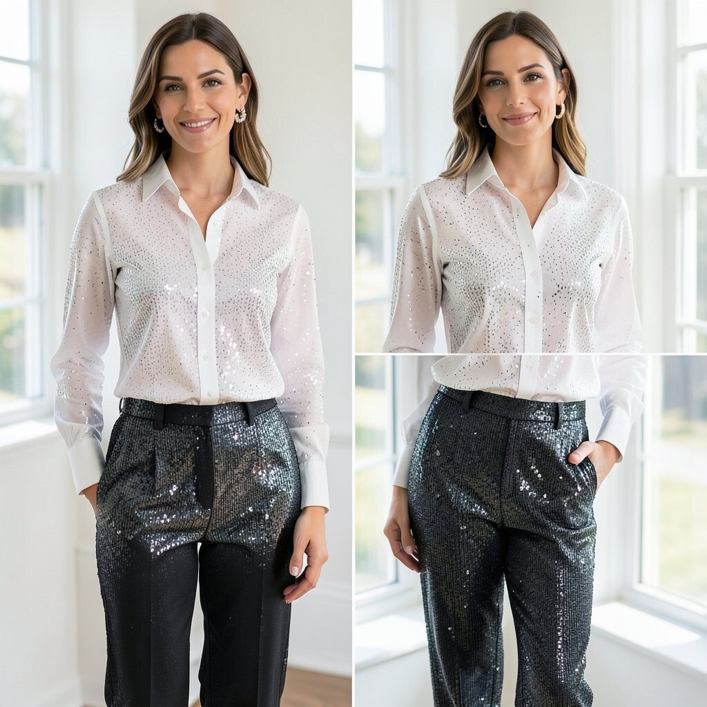 Elevate your white shirt by pairing it with a sequined skirt or pants for a glamorous look. Sequins add sparkle and make this outfit perfect for parties or festive occasions. Keep the shirt simple to let the sequins shine.