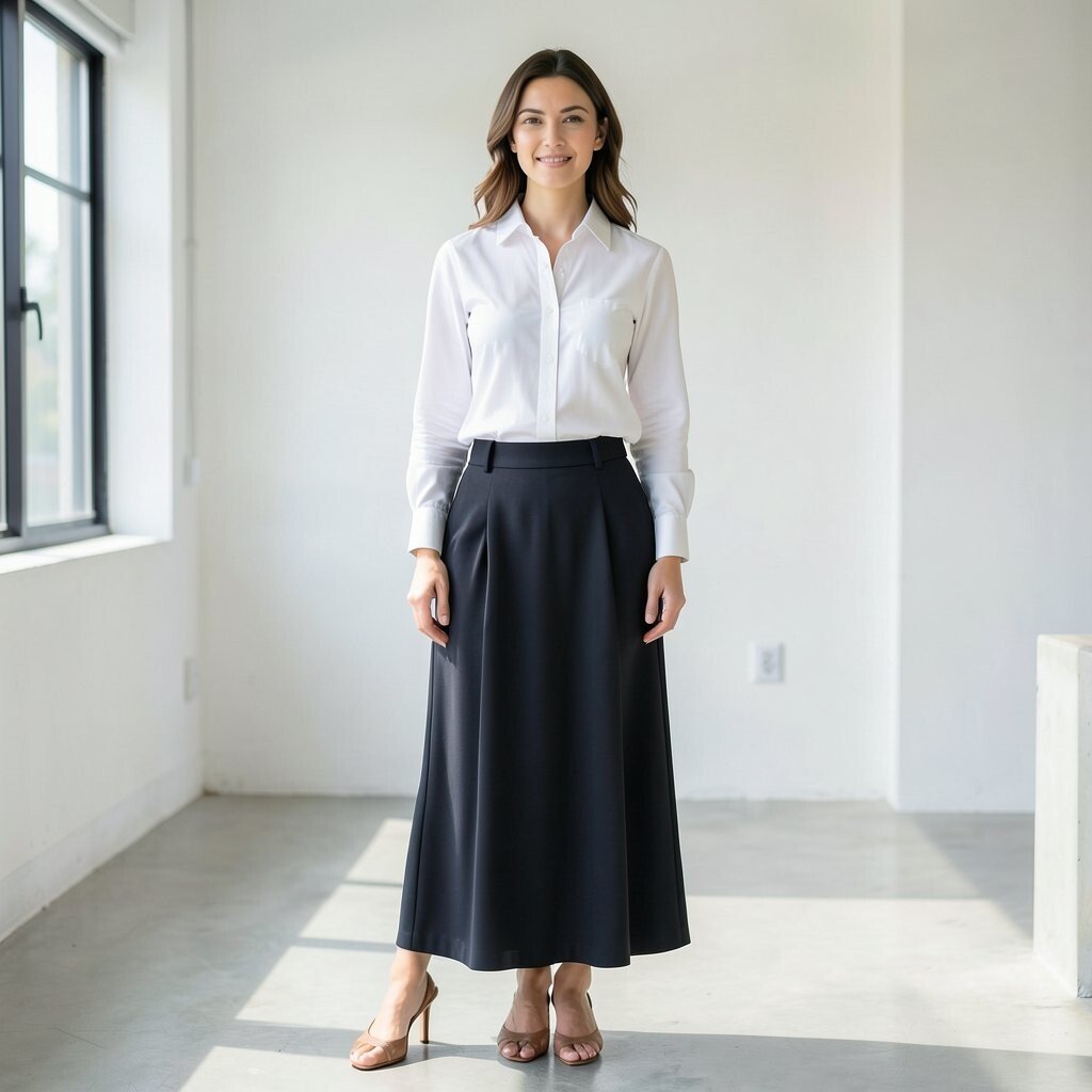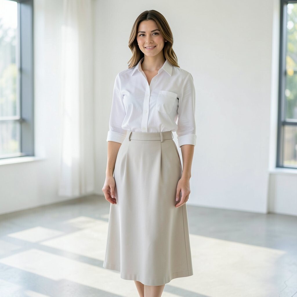 Pairing your white shirt with a midi skirt creates a feminine and elegant look. The length of the skirt adds sophistication while remaining comfortable.