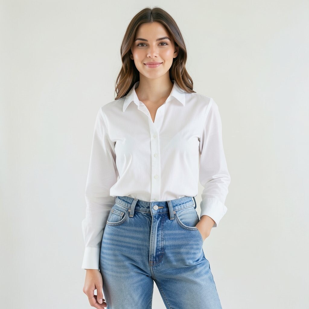 High-waisted jeans are a classic choice that complements a white shirt beautifully. They cinch your waist, giving a flattering silhouette and a timeless look.