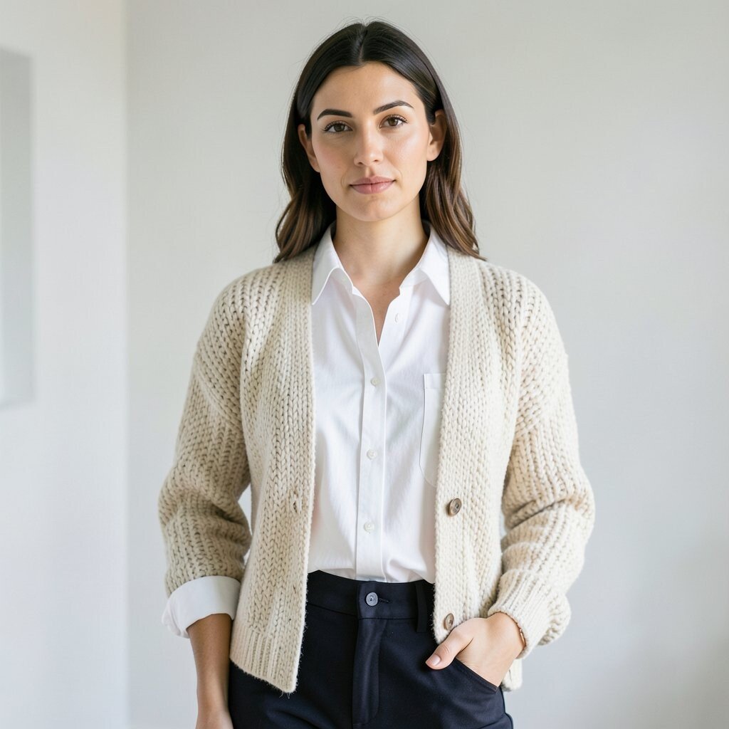 Layering a chunky knit cardigan over your white shirt adds warmth and texture. It’s like a cozy hug in outfit form.
