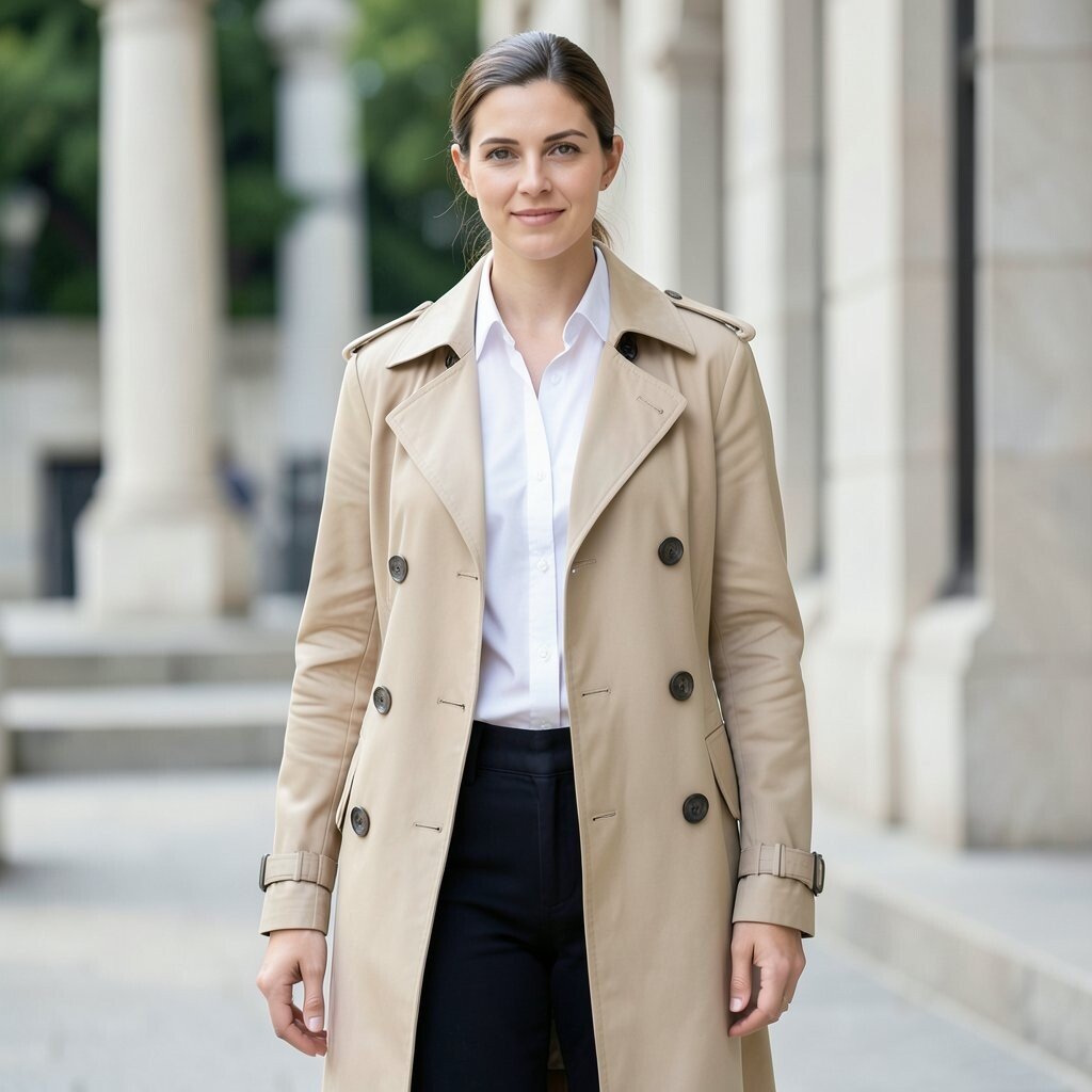 A trench coat over a white shirt offers a timeless, classy look. It’s ideal for transitioning between seasons.