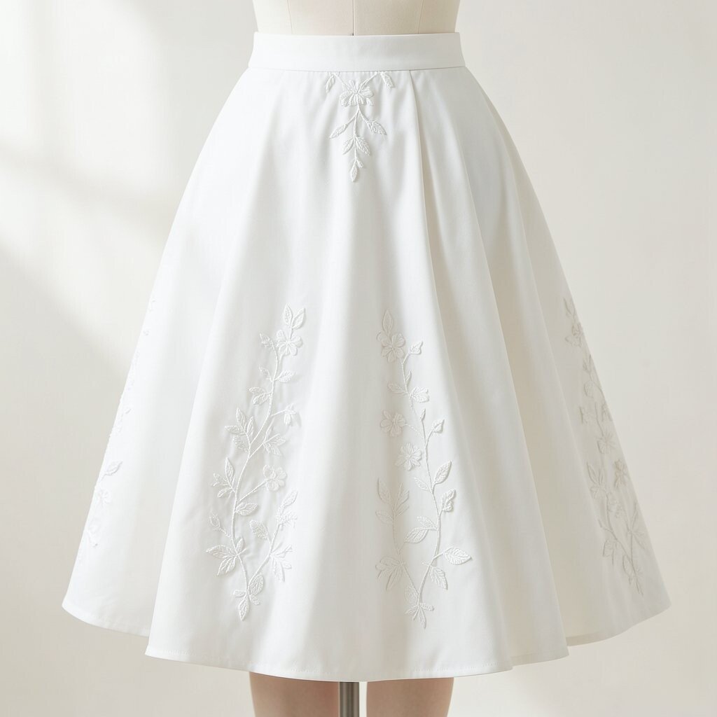 Embroidered designs add a touch of art to a white skirt. The intricate patterns create a unique and eye-catching look.