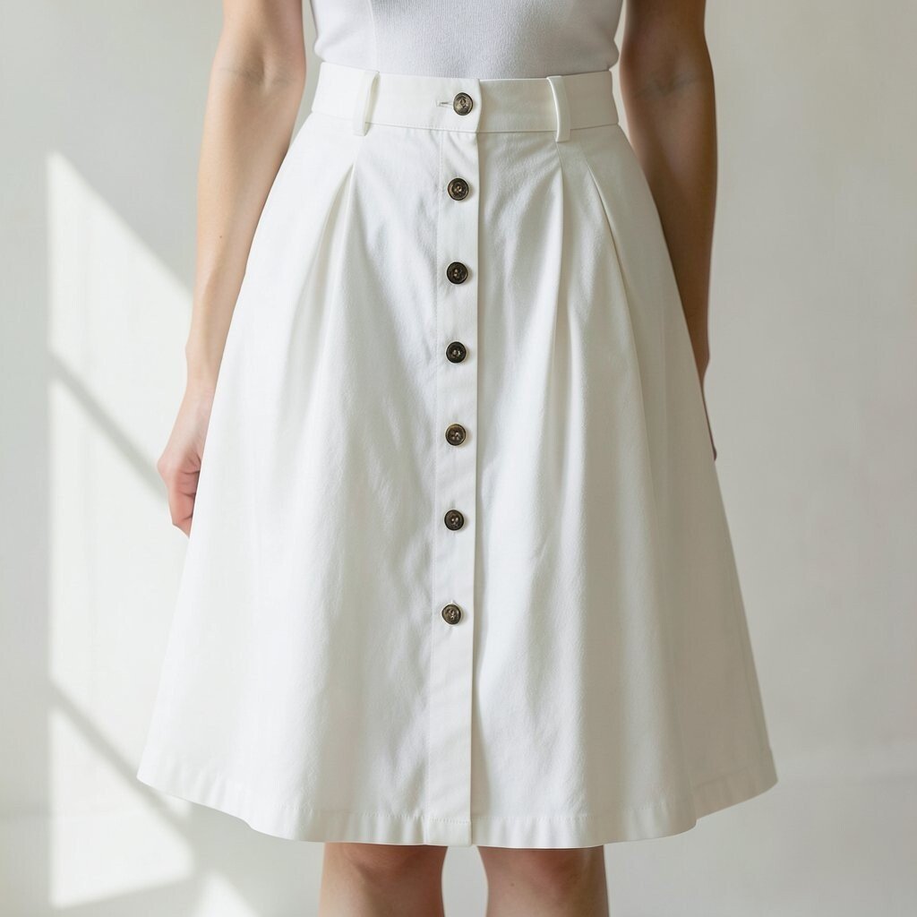 A button-down white skirt exudes vintage charm. The buttons add a subtle detail that elevates the overall look.