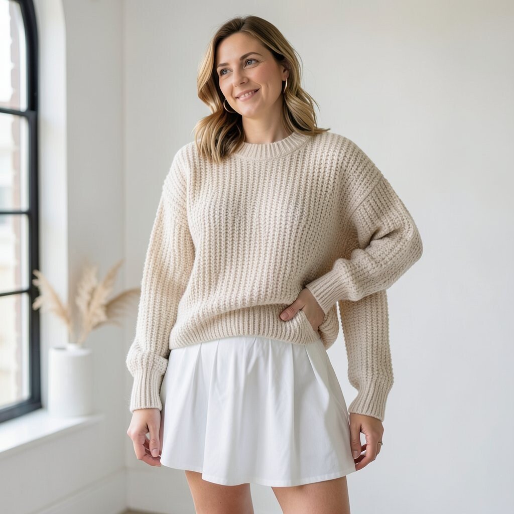 This look is cozy and stylish, great for a walk in the park or a coffee date. The texture of the sweater adds depth.