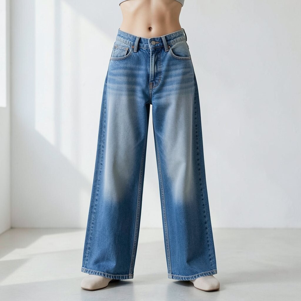 The classic denim blue wide-leg jeans are an evergreen choice. They seamlessly blend with any wardrobe.