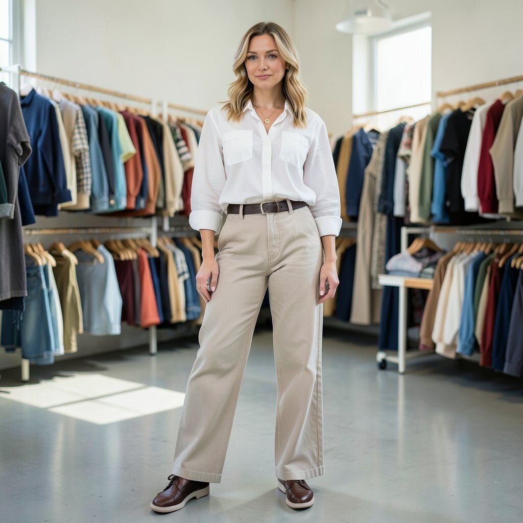 Thrift stores often have a variety of khaki options. They’re a practical choice that can be dressed up or down.