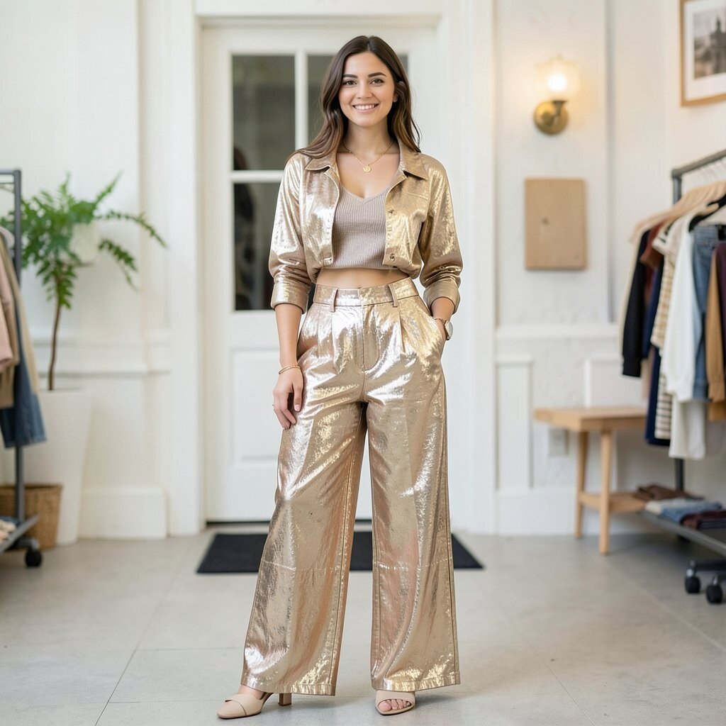 Metallic wide leg pants are a showstopper. They add a futuristic touch to your wardrobe.
