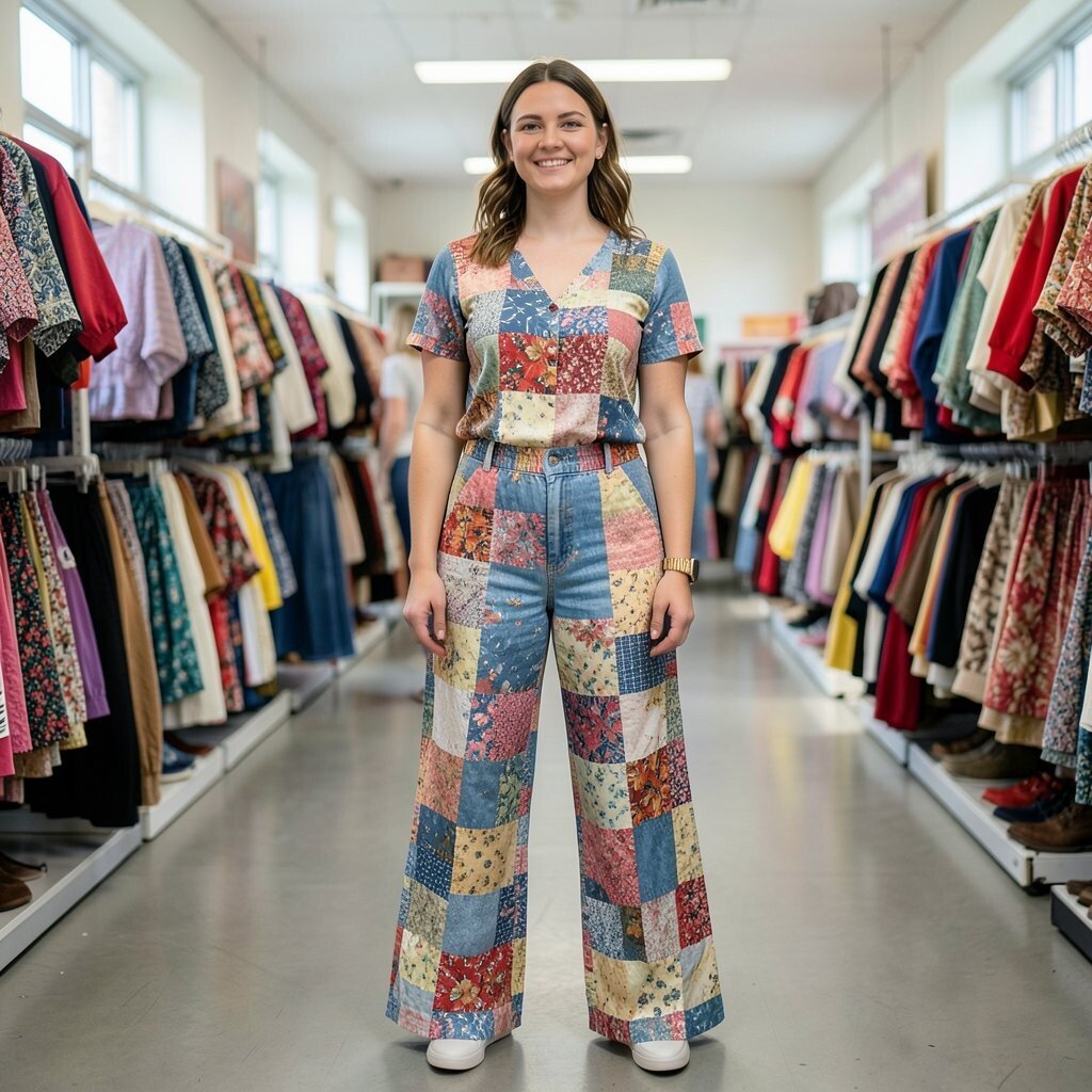 Thrift stores are a great place to find unique patch designs. These pants are a creative and stylish choice.