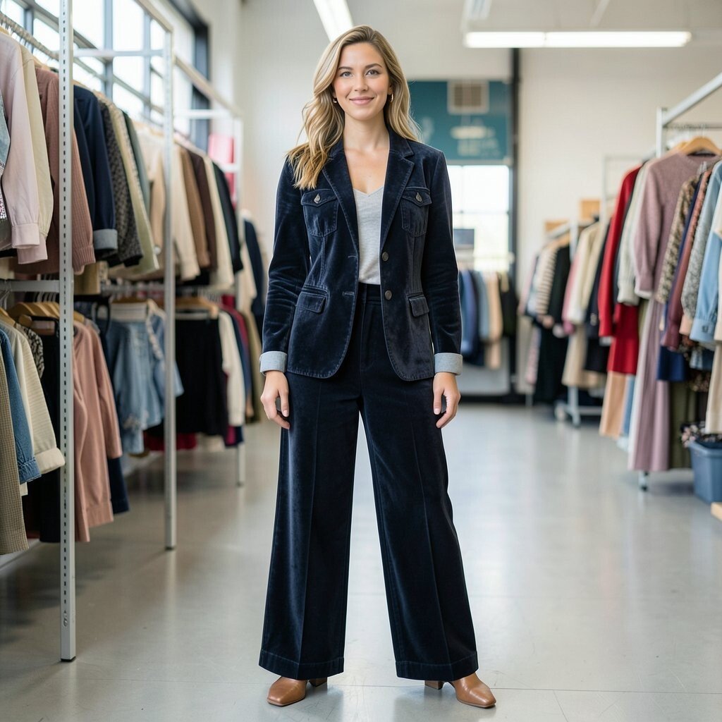 Look for quality fabric at thrift stores. Navy is a timeless color that’s easy to wear.