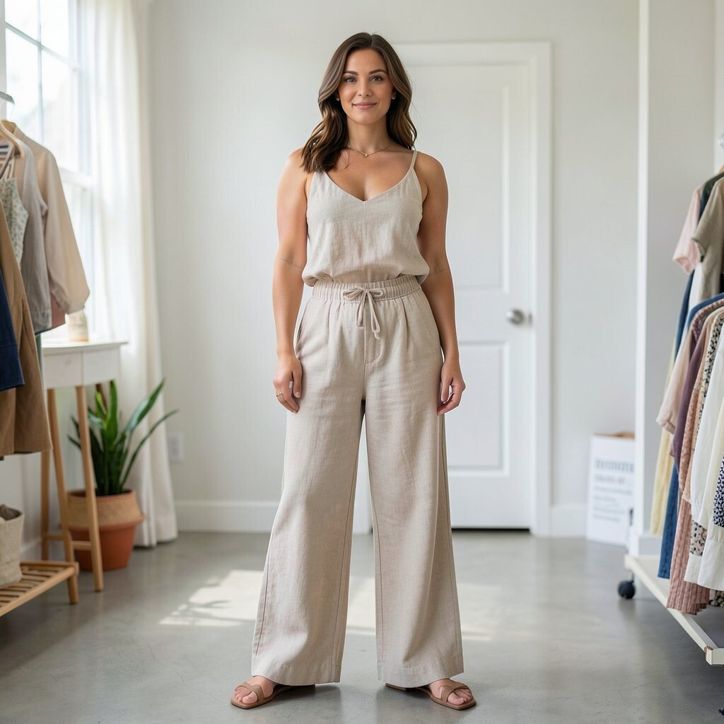 Look for neutral shades like beige or white. Linen pants are a summer staple, and a thrift store can be your treasure chest.